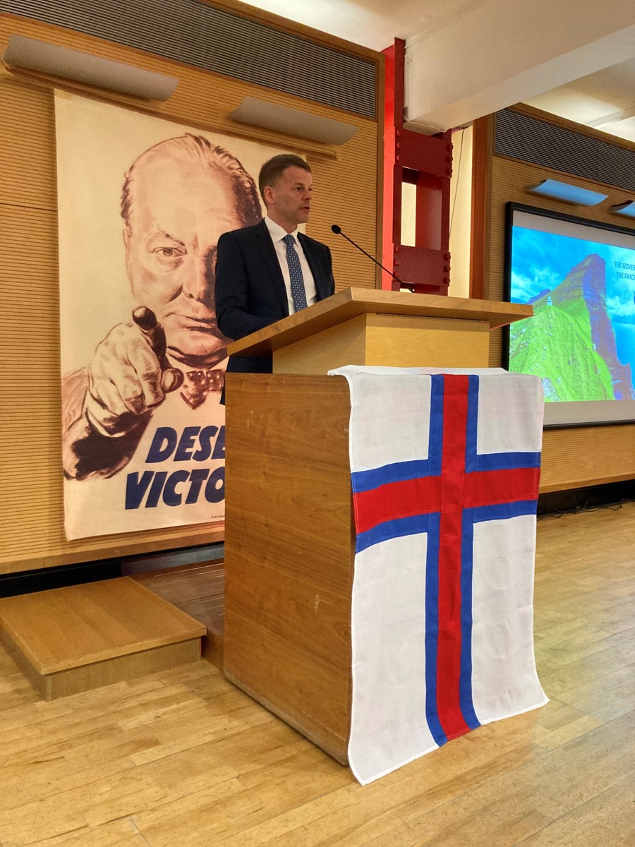Um kvøldið skipaði Sendistova Føroya fyri serligum flaggdagshaldi, har dentur varð lagdur á bretsku hersetingina undir seinna heimsbardaga. Í røðu síni vísti løgmaður m.a. á, tað tætta søguliga samband ið er millum Føroyar og Bretland, og vísti á tann stóra týdning, ið Føroyar høvdu fyri Bretland undir seinna heimsbardaga. Serliga legði løgmaður dent á tann stóra kostnað fyri Føroyar, tá føroysk skip sigldu vandasigling til Bretlands við fiski. Føroyar mistu 25 skip og umleið 200 føroyskir sjómenn lótu lív. Meiri enn ein 20% av øllum fiskinum ið bleiv etin í Bretlandi undir krígnum, kom úr Føroyum.