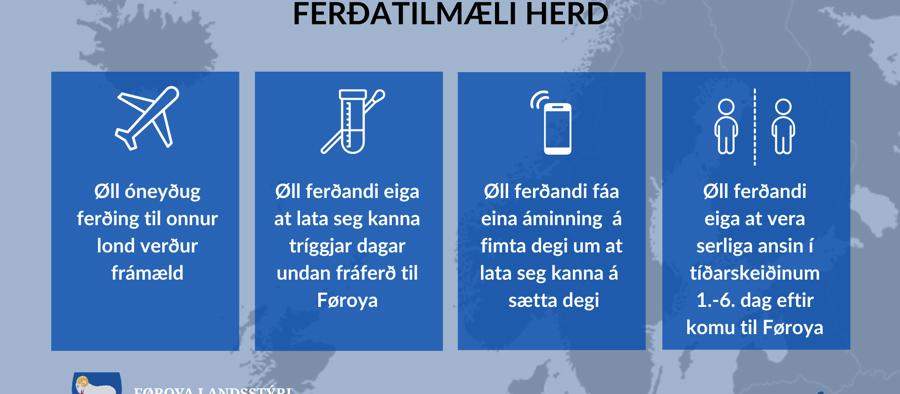 Landsstýrið tekur nú stig til at herða ferðatilmælini. Á tíðindafundi fyrrapartin gjørdi løgmaður greitt, at sama um koronustøðan í Føroyum er góð í løtuni, so er neyðugt at styrkja átøkini kring mørkini til Føroya, tí tað er júst har, at okkara høvuðssmittukelda er.
