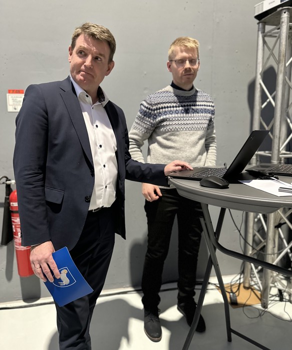 Løgmaður setir battarískipanina í gongd við hjálp frá Eiriki Norðberg, verkætlanarleiðara.